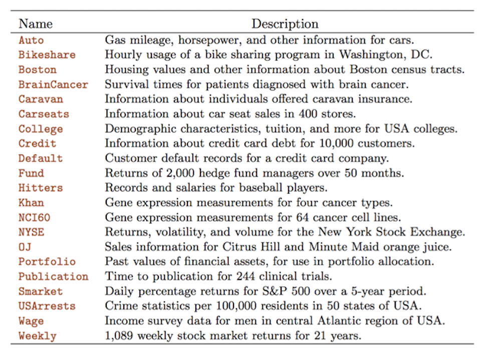 教科书配套的 R 包 ISLR2 提供了非常丰富的数据集: