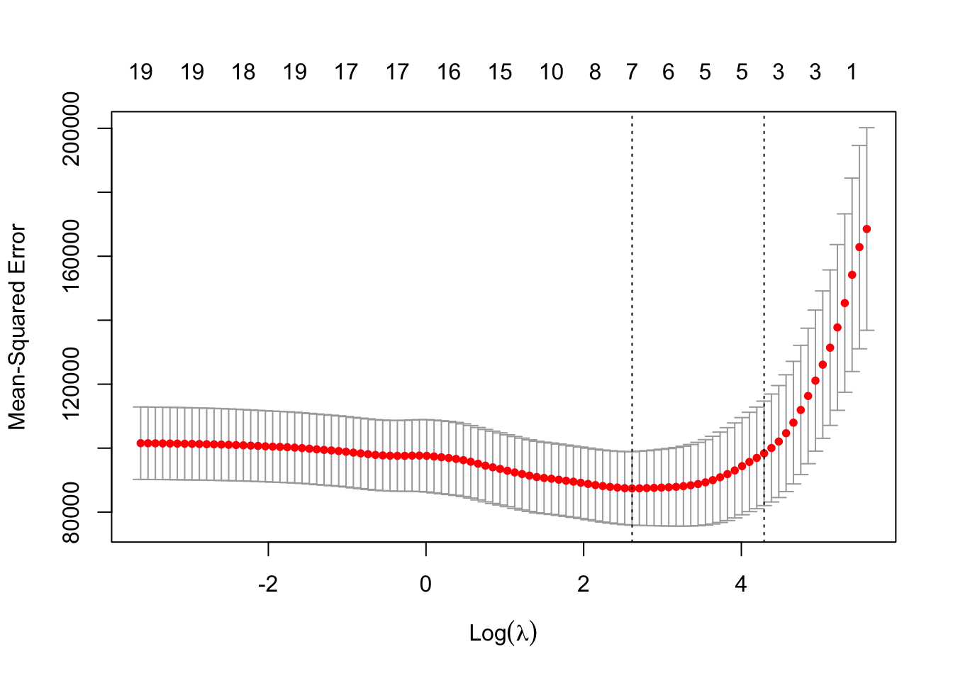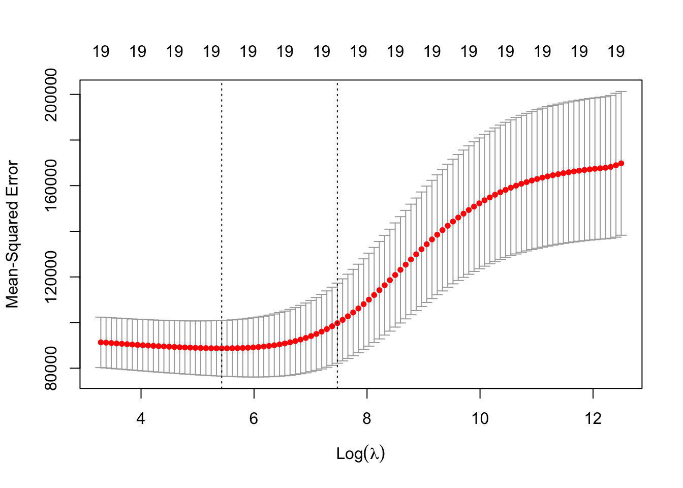Here we see that 12 of the 19 coefficient estimates are exactly zero. So the lasso model with λ chosen by cross-validation contains only seven variables.