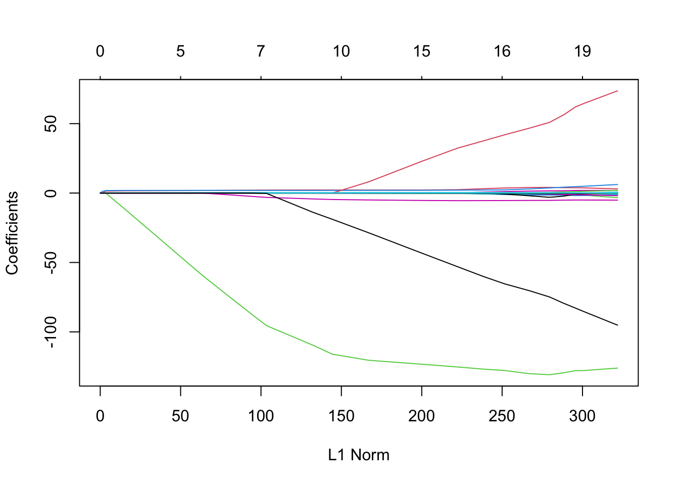 This function has slightly different syntax from other model-fitting functions that we have encountered. In particular, we must pass in an x matrix as well as a y vector, and we do not use the y ∼ x syntax.