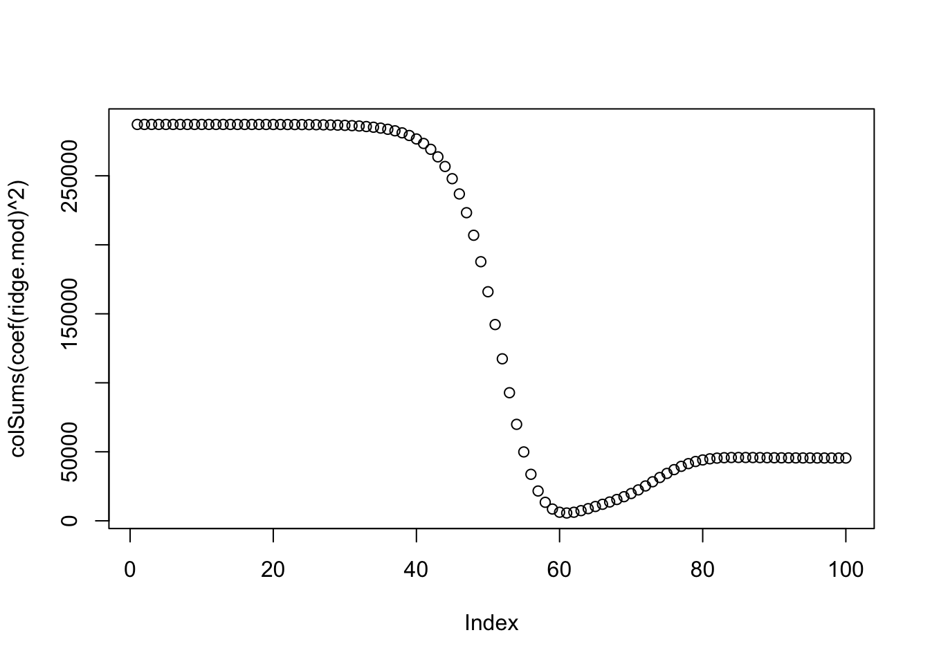 plot(colSums(coef(ridge.mod)^2))