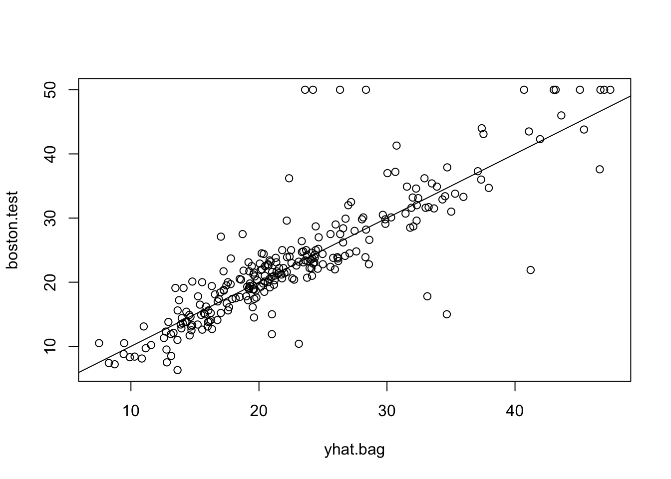 plot(yhat.bag, boston.test)
