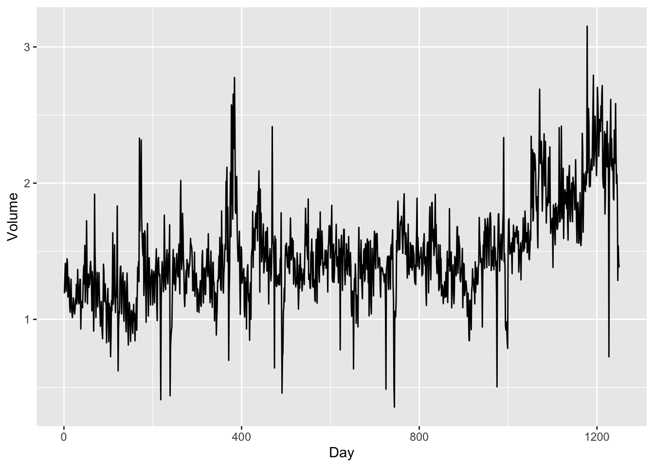 Each individual variable in Smarket is actually time series data, from year 2001 to year 2005. Let’s plot the time trend of Volume: