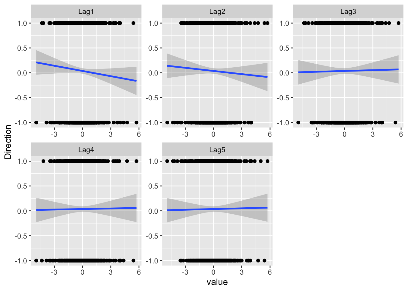 Then, let’s plot the Lags against Direction. At the same time, we also encode “Up” and “Down” as “1” and “-1” respectively, and add the fitting lines. The reason is that there are two “theories” about how the stock price today will affect its price tomorrow: the momentum effect and the reversal effect.